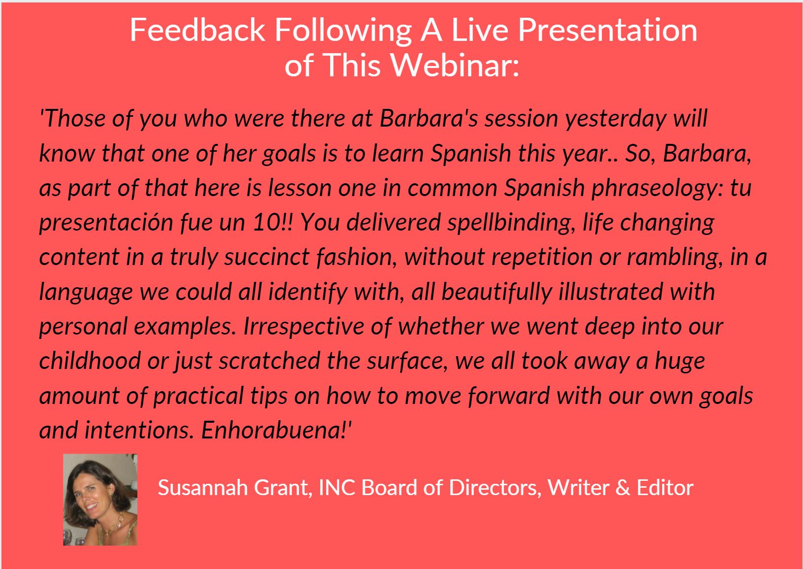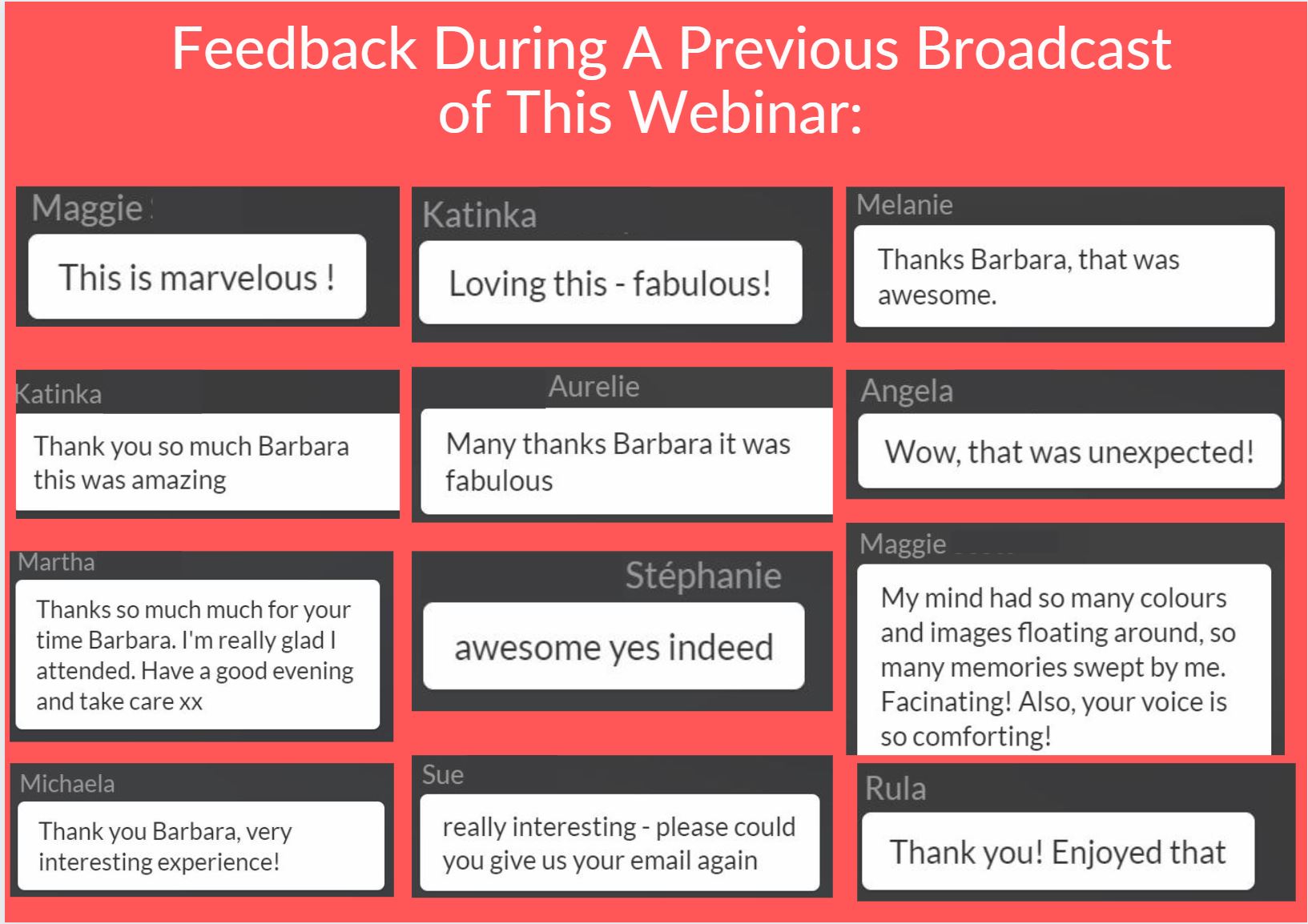 That part of the guided visualization in this workshop requires you to briefly look back on potentially upsetting memories and imagined scenarios from your childhood. If you have severe trauma or abuse in your childhood it is recommended that you do these exercises with a qualified therapist rather than on your own, unless you have already done significant psychological work on your past with a professional. It is your responsibility to keep yourself mentally and physically safe while reviewing your past, and you should be confident you can now look back and keep yourself mentally and physically safe while doing so. You may still participate in the workshop but when Barbara indicates you should mute the sound for the regression and then she will indicate again when you can turn the sound back on for the 'positive' section of the guided visualization, and you will still benefit from the exercise.